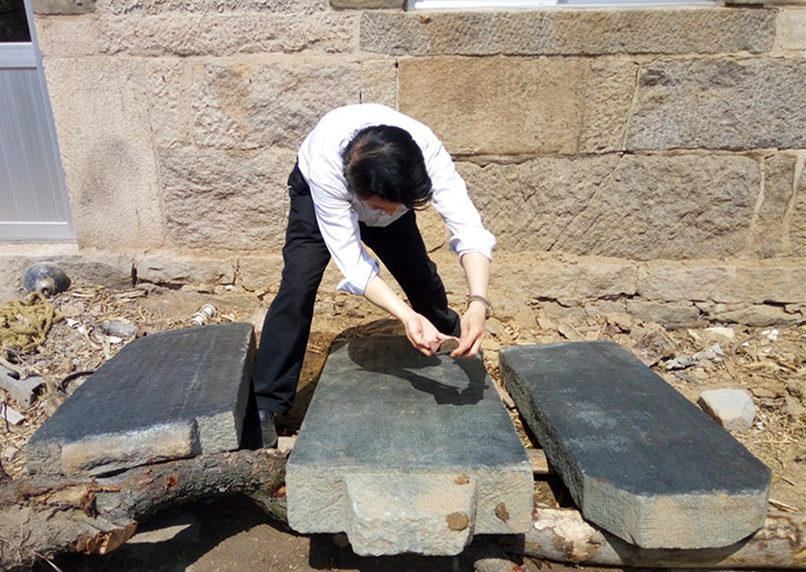 我们在村边遇见了村民王进昌老人,在与老人的交谈中,详细询问了解了“神仙殿”的占地面积丶建筑规模丶院落格局丶山门朝向丶房屋间数丶殿内塑像丶碑刻丶设施及王家世代看守“神仙殿”和宫氏祖茔等情况。随后我们来到村里,察看“神仙殿”遗留下来的三块石碑,我们对石碑字迹进行了清洗和初步辨认。