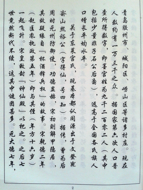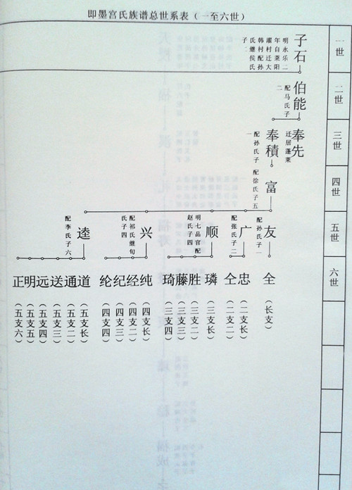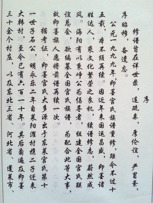 山东即墨宫氏主要发祥地位于青岛即墨市大韩村,是东莱宫氏重要分支之一,是东莱宫氏11世祖子石公后裔,出自莱阳濯村。经过500多年的繁衍生息,以大韩村为发展中心,现在的即墨宫氏已经遍布30余个自然村庄,宫氏家族的经济实体繁荣富强,宫氏家族人才济济,在各行各业取得一个有一个的成绩,真可谓:“即墨文化古 宫氏家族兴”。本次修谱,得到中国宫氏联谊总会的大力支持,得到大韩村两委的鼎力相助,得到宫氏家族的积极拥护,发起人:宫垂松、宫振中、宫象兰、宫相旭、宫兆寿、宫兆鹏、宫兆明、宫垂宝。主编:宫相旭。校审:宫兆林、宫克俭。以及30个村庄的主办人。《即墨宫氏族谱》欣赏:
